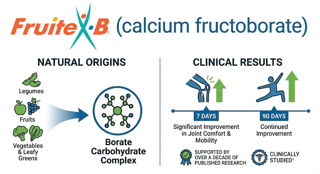 A patented ingredient identical to the borate carbohydrate complex commonly found in legumes, fruits, vegetables, and certain beans. It is supported by over a decade of published research. In clinical studies, a significant improvement in joint comfort and mobility was observed in as little as 7 days with continued improvement over a 90-day period of time.1